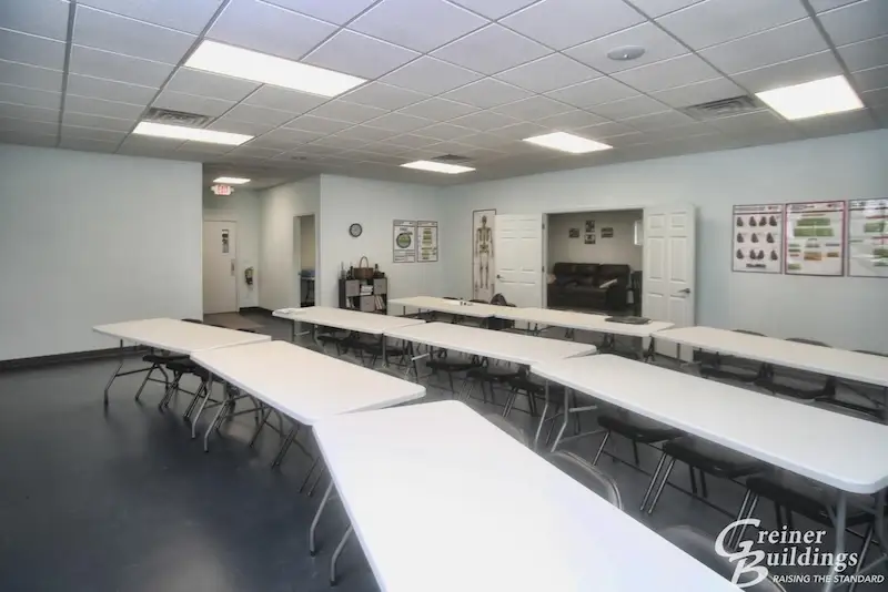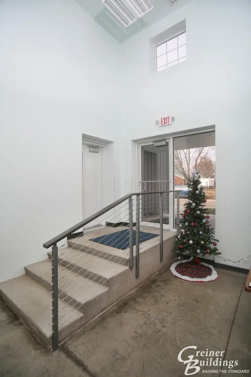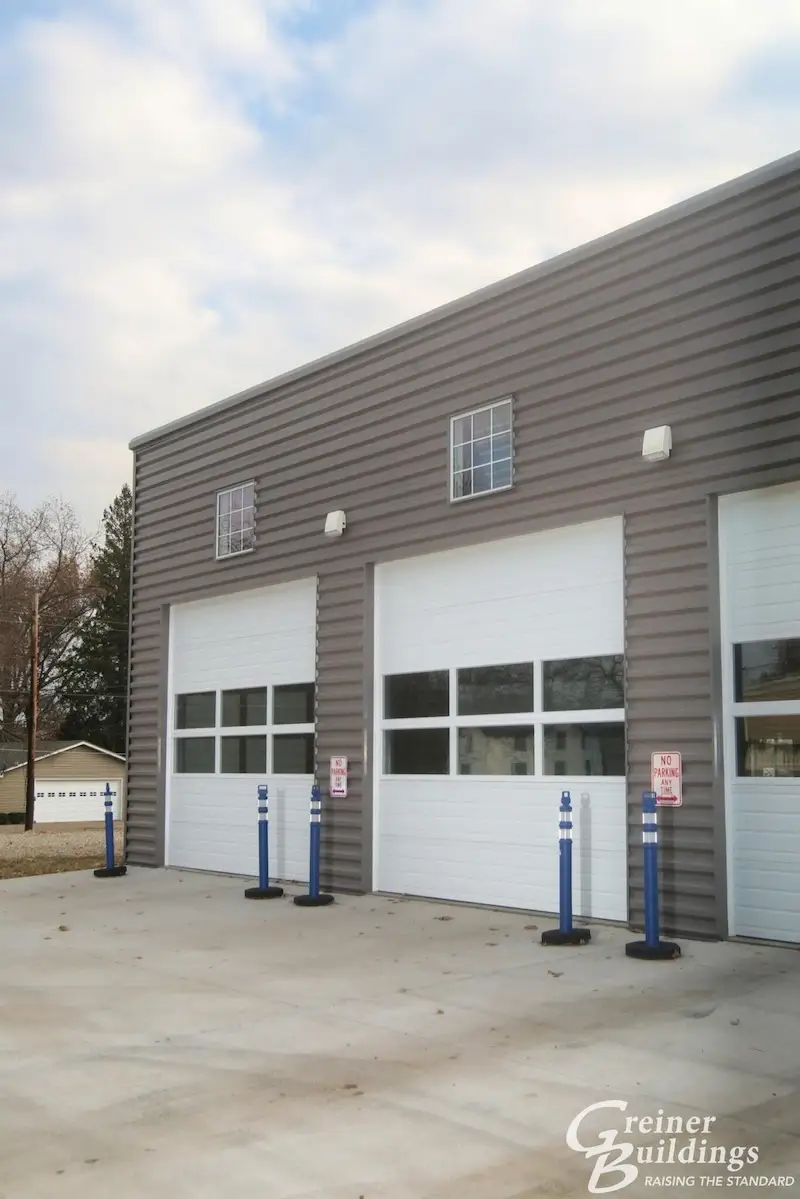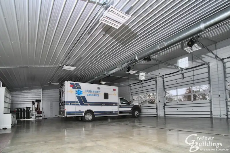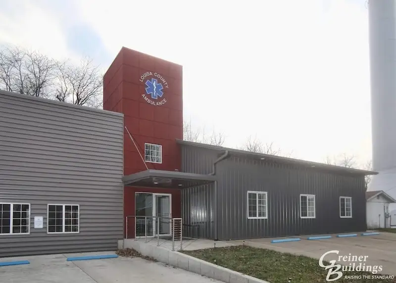 This mono-slope post-frame building addition provided new garage space with heated floors for the ambulance service, two bedrooms and full bath for employees. The existing building, which previously was the garage/office space, was converted to a training room, two offices, kitchen, lounge area and bath. The new and existing building were connected by a two-story entry tower to make the transition flow focally. The large windowed garage doors add natural light to the large shop area.